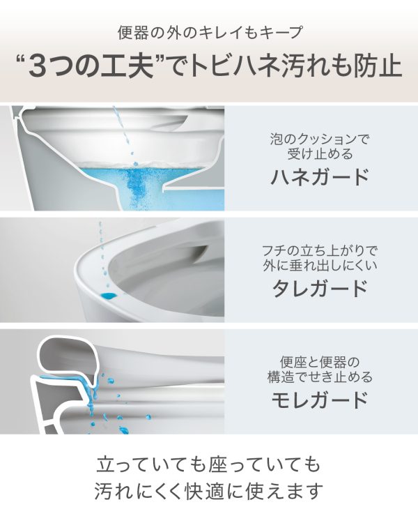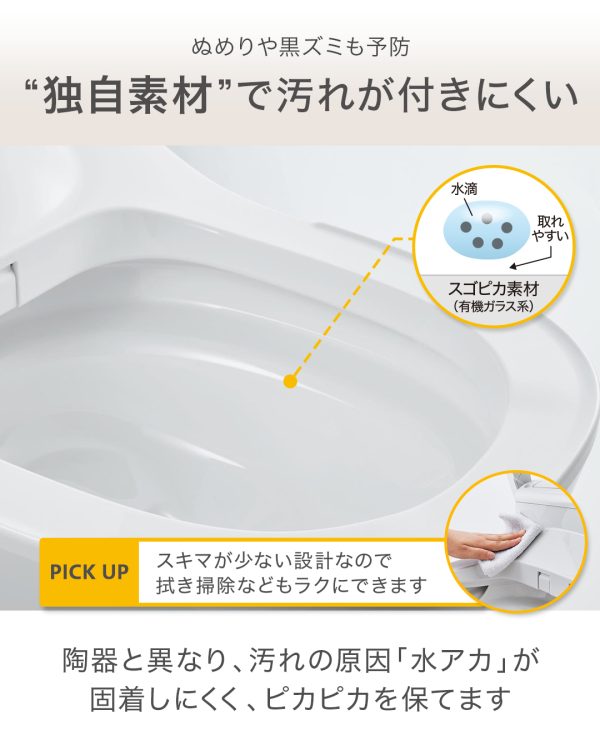 独自素材で水アカの固着を防ぐのでぬめりや黒ズミもつきにくく、設計の工夫により空間への「トビハネ汚れ」にも配慮しており、